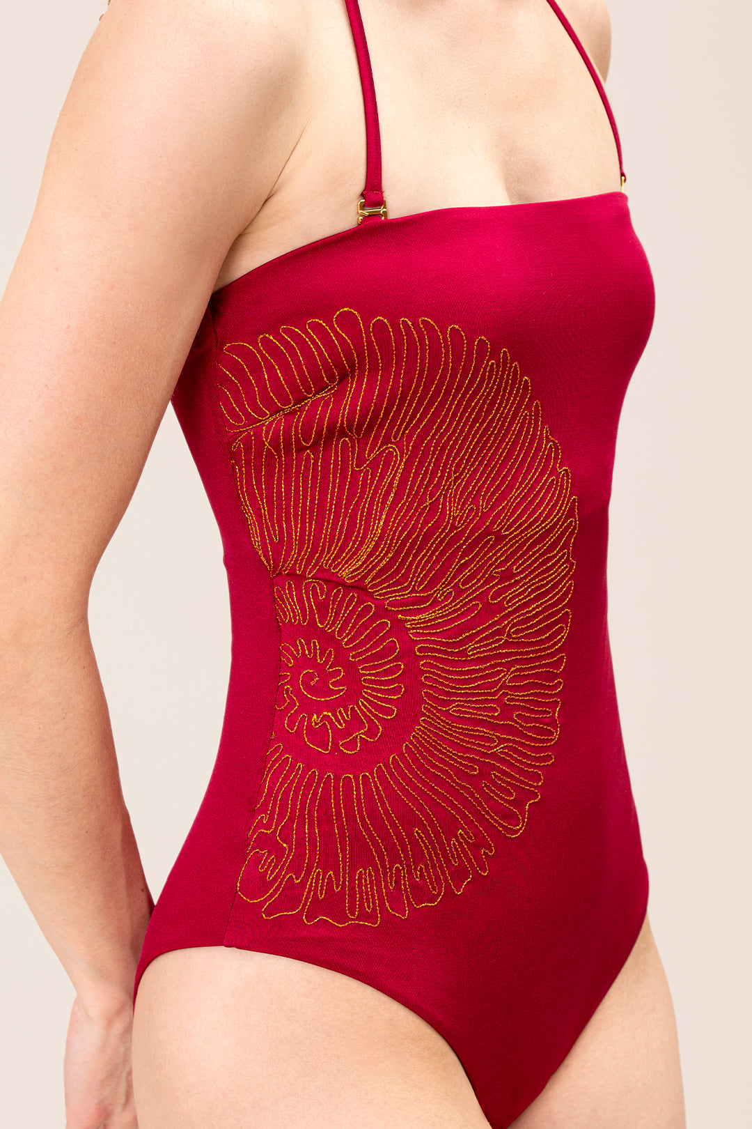 Vestido de baño entero con cobertura media, ideal para la playa o como body, está confeccionado en una tela de aspecto brillante y cuenta con un elegante bordado de fósil dorado. versátil y fácil de combinar con falda, pantalones o jeans, es una opción sofisticada y perfecta para días en la playa o diversas ocasiones de uso.Composición y cuidados