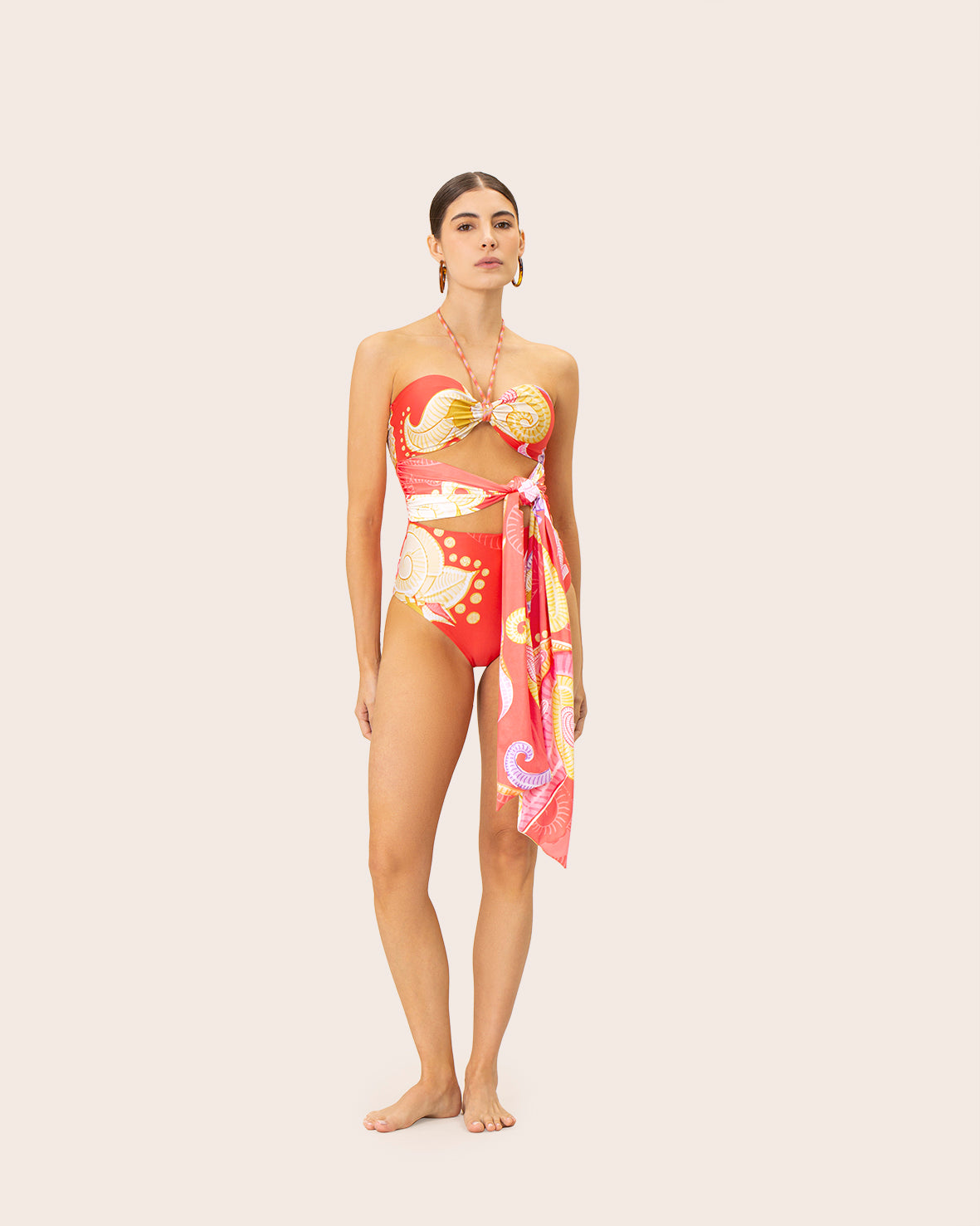 Entero con estampado paisley en tonos coral, violeta y amarillo, con copas removibles y cargaderas en cordones multicolor con detalles ondulados. Una pieza única, moderna y versátil que puedes usar en la playa o como body para elevar cualquier look con personalidad.