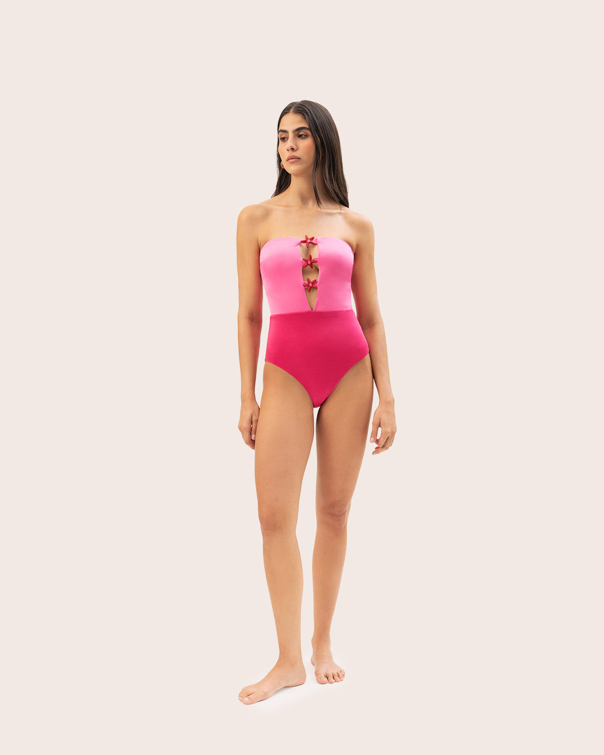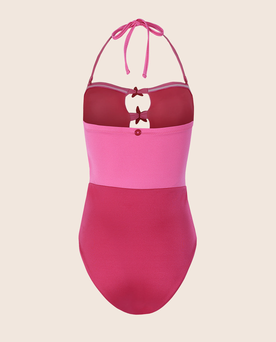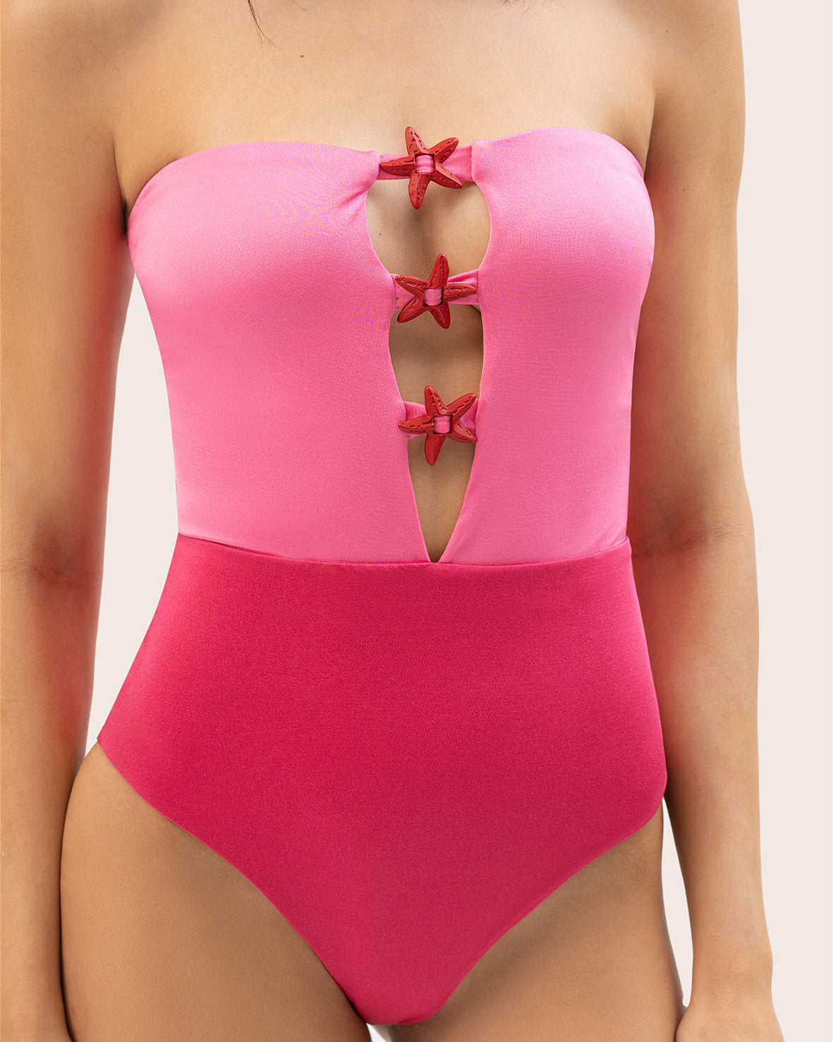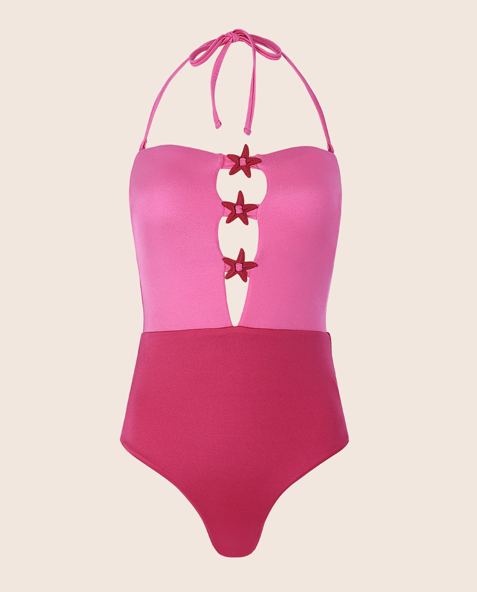 Entero bicolor en tonos rosados, diseñado con un delicado detalle de estrellas en el centro del frente. Confeccionado en una tela satinada de acabado brillante y tacto ultrasuave, cargaderas ajustables y copas removibles. Una pieza versátil pensada para elevar tus looks, úsalo como vestido de baño o llévalo como body combinado con jeans o pantalones para crear un estilo moderno y distintivo.