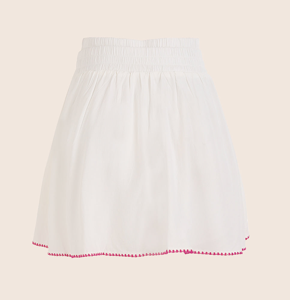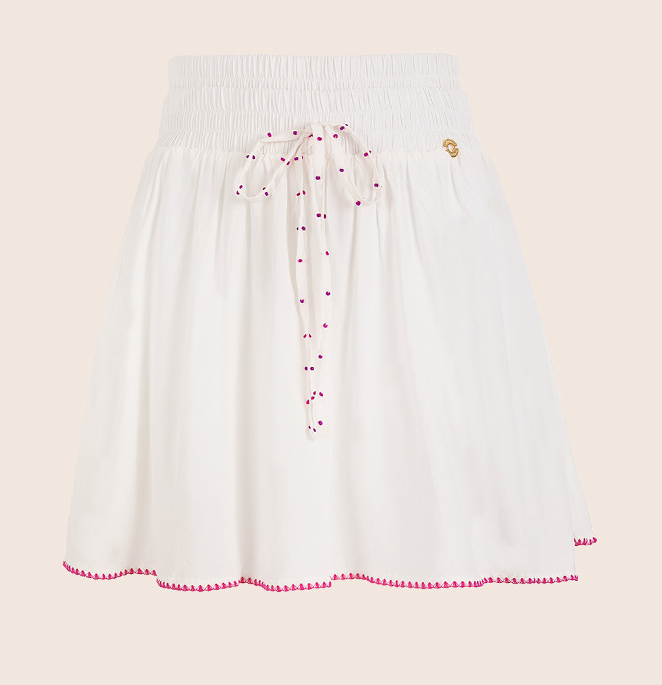Falda corta en tono crudo con doble pretina y delicados detalles artesanales, borde de crochet en contraste y aplicaciones en jarena con canutillos, hechas a mano por talentosas artesanas locales. Un diseño que combina libertad, estilo y sofisticación.