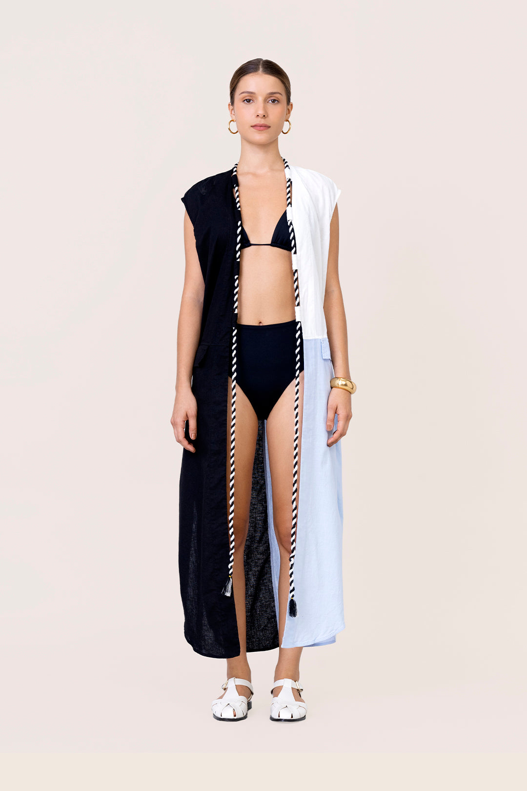 Kimono largo noam, confeccionado en una tela ligera que aporta movimiento y frescura, ideal para complementar tus looks de verano con un toque elegante y distintivo. su diseño en bloques de color negro, azul y marfil y detalle de cordon manual en escote le da un aire sofisticado y contemporáneo, cargado de personalidad y carácter. con su silueta fluida y versátil, noam se convierte en esa prenda única que eleva cualquier look con elegancia sin esfuerzo. pensado para mujeres que encuentran belleza en los detalles sutiles, pero que también disfrutan destacar con piezas llenas de intención, fuerza y estilo atemporal.Composición y cuidados