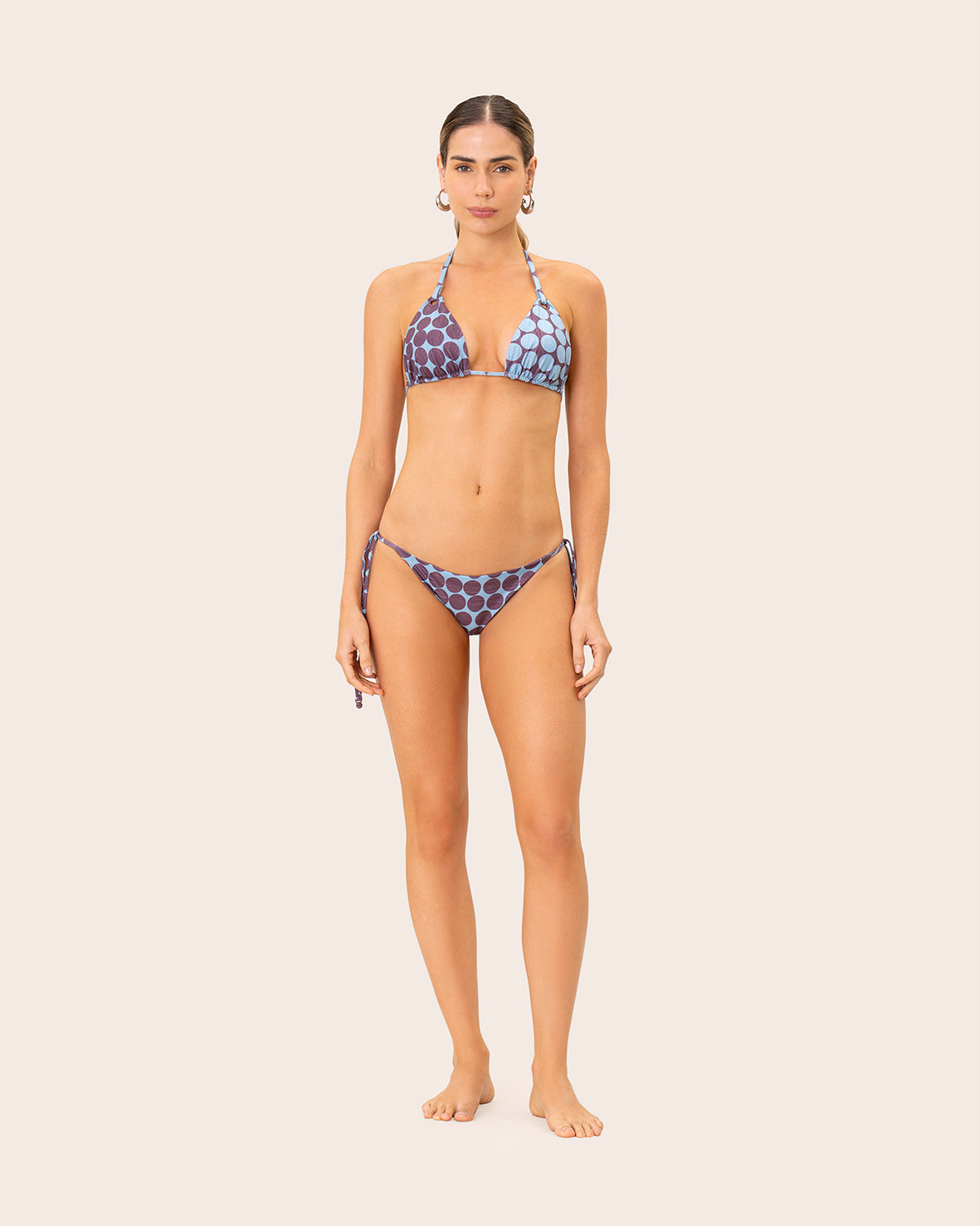 Panty de bronceo confeccionado en una tela de acabado brillante en tonos azul y vino, una combinación sofisticada que destaca por su contraste elegante. Su estampado bicolor de polka dots aporta un toque fresco, moderno y lleno de personalidad. Los laterales ajustables garantizan un fit cómodo y perfecto, adaptándose con suavidad a tu cuerpo. Ideal para la mujer que quiere sentirse linda, segura y auténtica durante sus días de verano. El complemento ideal para elevar tu estilo con un aire juvenil y sofisticado.