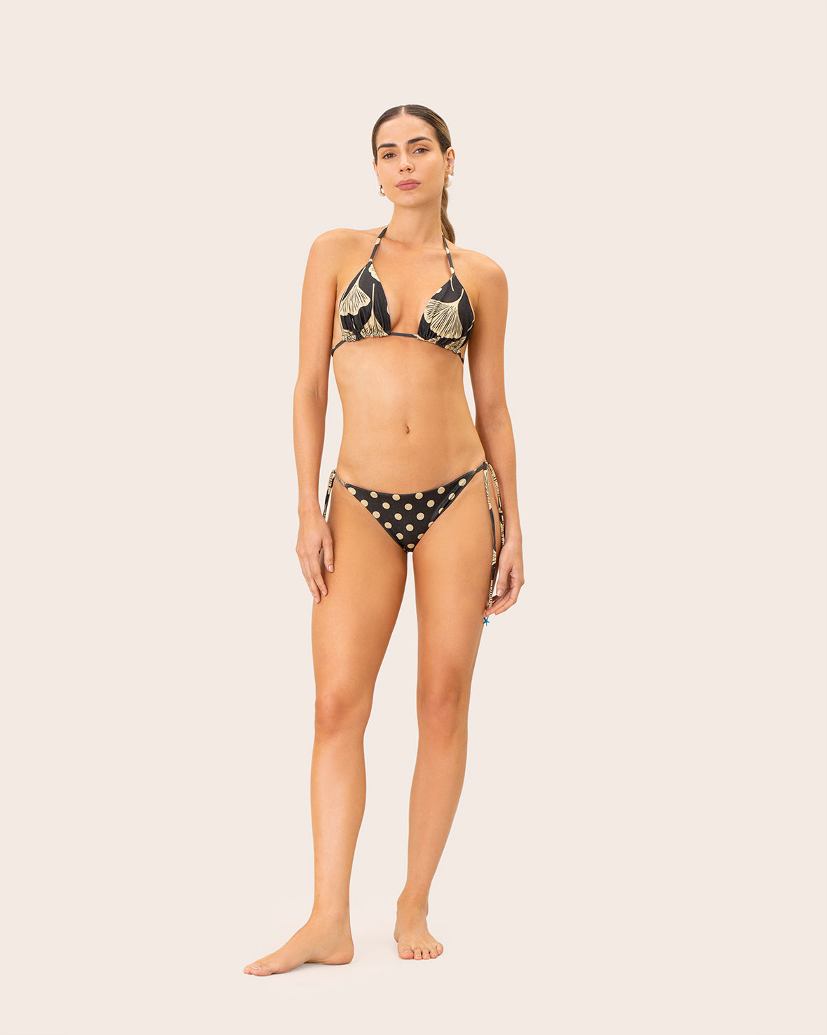 Panty de bronceo, confeccionado en una tela de acabado brillante en tonos negro y butter yellow, con un delicado estampado polka dots que aporta un toque fresco y moderno. Sus laterales ajustables garantizan un fit perfecto y cómodo, adaptándose a tu cuerpo con suavidad. Ideal para la mujer que desea sentirse linda, segura y sofisticada en sus días de verano. El complemento perfecto para resaltar tu estilo con un aire juvenil y auténtico.