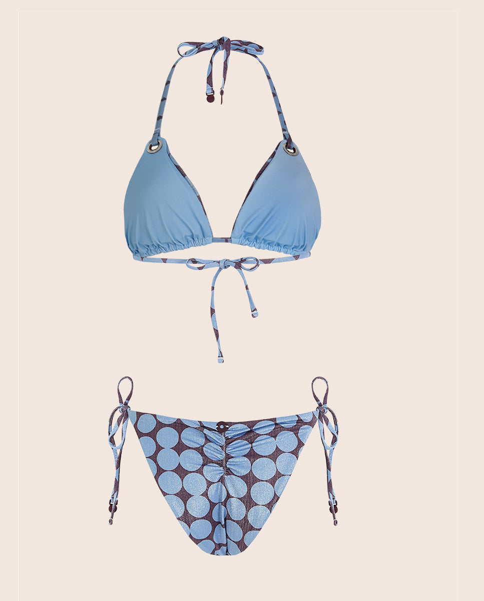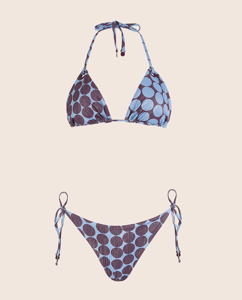 Top de bronceo confeccionado en una tela de acabado brillante en tonos azul y vino, una combinación sofisticada que destaca por su contraste elegante. Su estampado bicolor de polka dots aporta un toque fresco, moderno y lleno de personalidad. El diseño resalta la autenticidad y el estilo de una mujer segura y sofisticada. Incluye copas removibles y cargaderas ajustables para un ajuste cómodo y completamente personalizado, además de detalles de ojales en tono vino que elevan la prenda con sutileza. Ideal para complementar tus looks de verano con un toque femenino, juvenil y lleno de carácter.