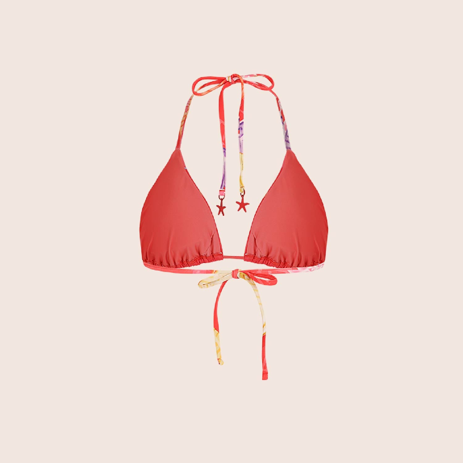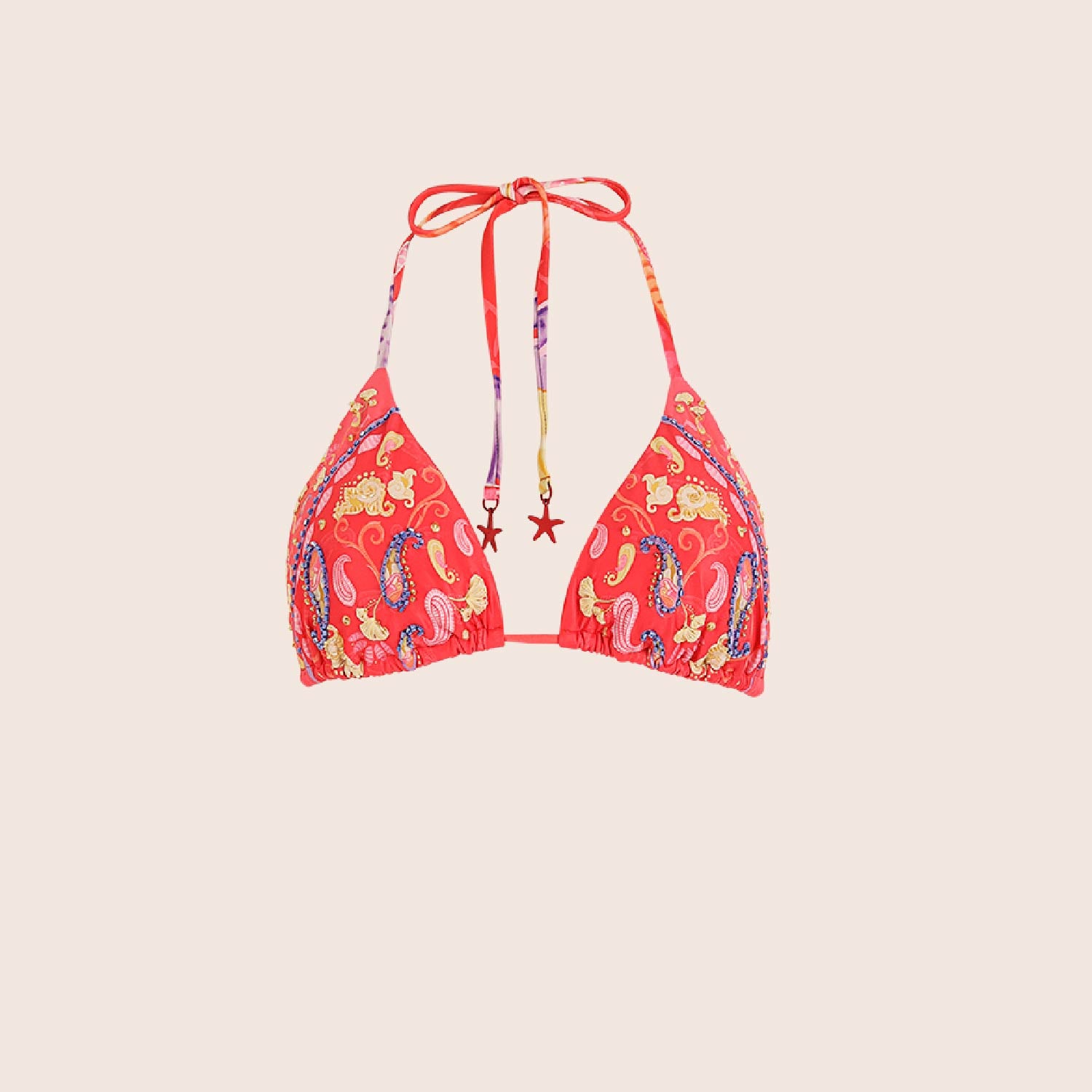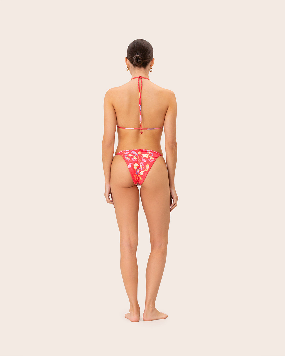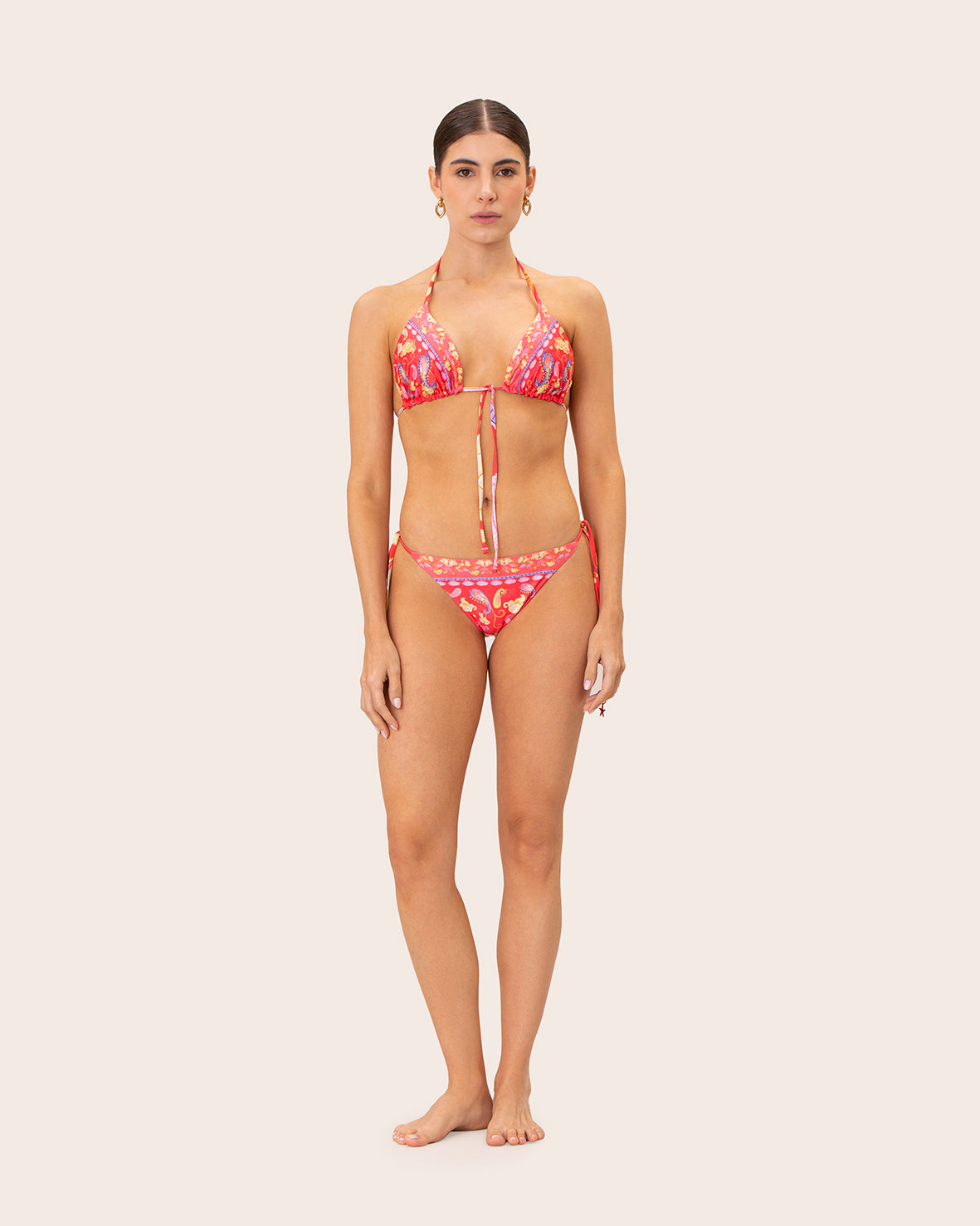 Top triángulo con estampado paisley localizado en vibrantes tonos coral, violeta y amarillo, confeccionado en tela eco que brinda suavidad, elasticidad y un ajuste cómodo al cuerpo, cuidando el medio ambiente. Cuenta con copas removibles y cargaderas ajustables que permiten personalizar el fit y realzar la silueta de forma favorecedora. Los delicados detalles artesanales en las copas aportan un sello único y sofisticado, mientras su diseño minimalista y elegante resalta tu belleza natural bajo el sol. Ideal para broncearte y disfrutar los días de verano con total comodidad y estilo.