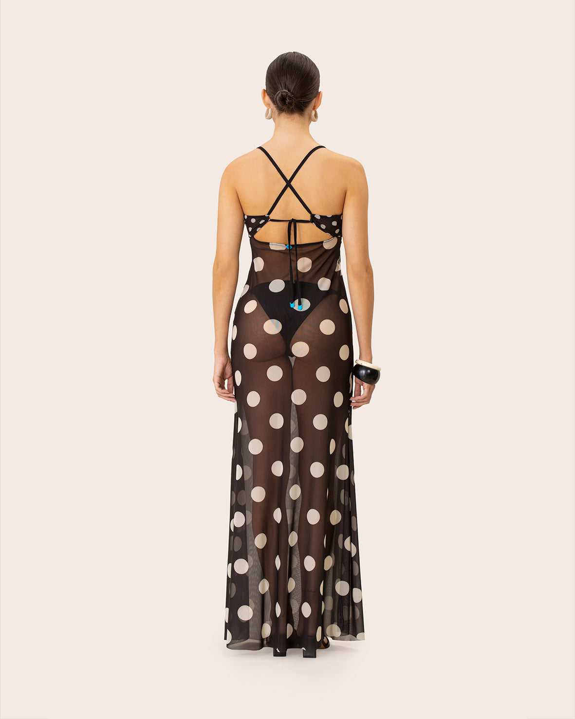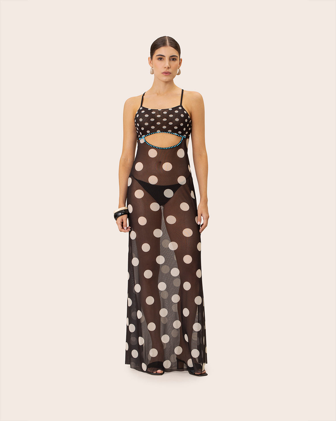 Vestido largo confeccionado en una base textil tipo mesh con un estampado de polka dots en tonos negro y butter yellow, que aporta frescura y un encanto moderno. La parte superior incorpora un detalle manual en la base de las copas, realizado por artesanas de la región, lo que añade un valor artesanal único. Su silueta está pensada para realzar cualquier look, resaltando la autenticidad y el estilo de una mujer segura, sofisticada y con personalidad propia.